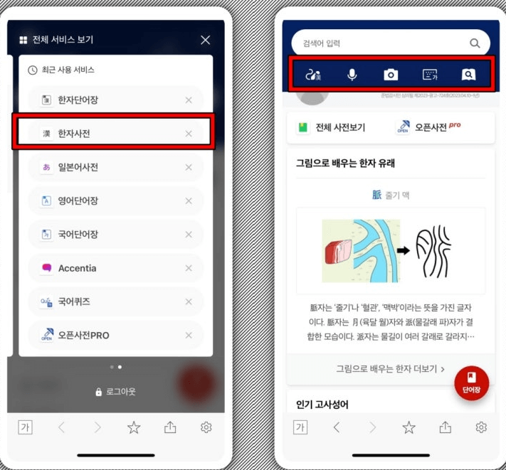 | 필기인식 | 붓 아이콘으로 손글씨 입력 | 모르는 한자도 쉽게 검색 |